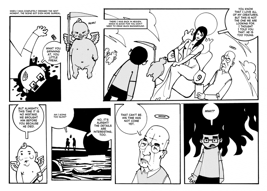 It was then published online at INKplosion, a webcomic publisher where I actually started out publishing in 2001. Wow. Long times. I am sorry for the small font. This looks better in print. :)