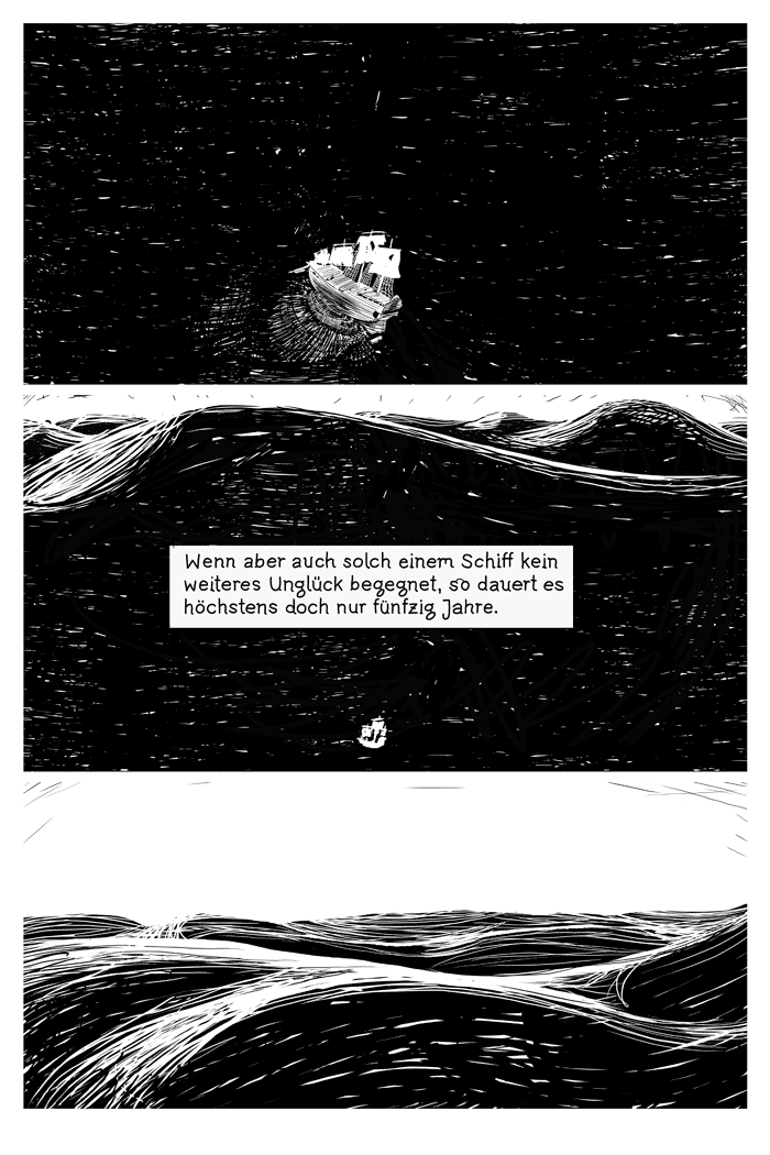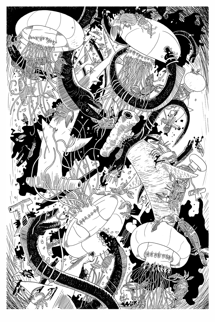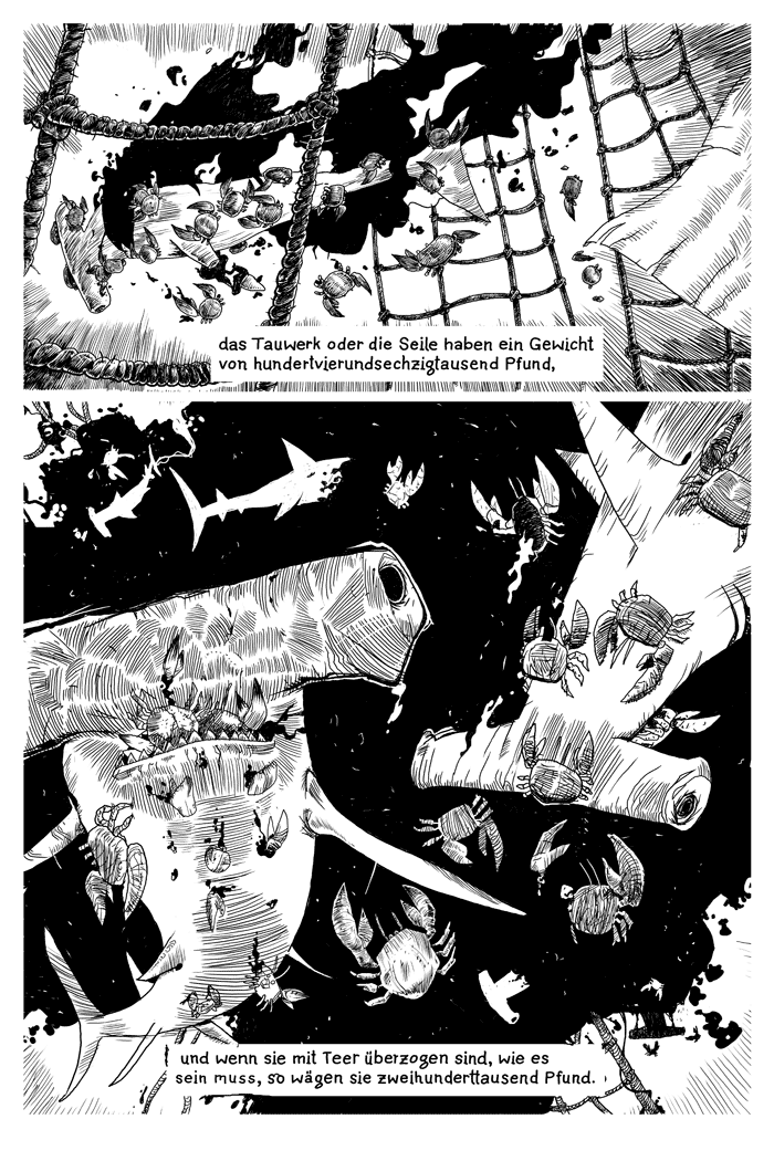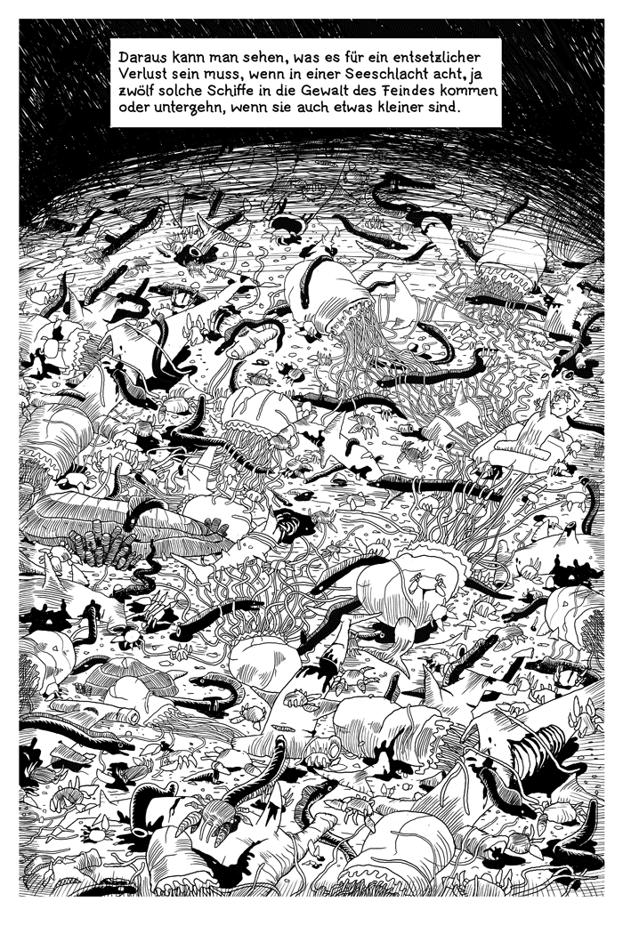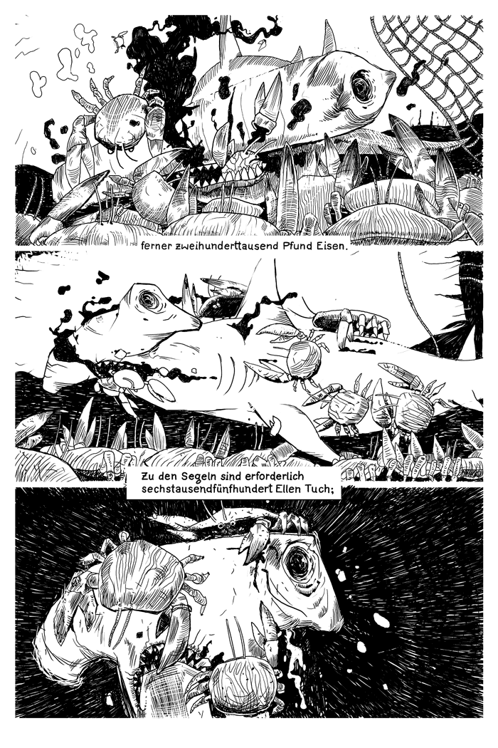 It is about sharks fighting crabs fighting baracudas around a sunken ship.